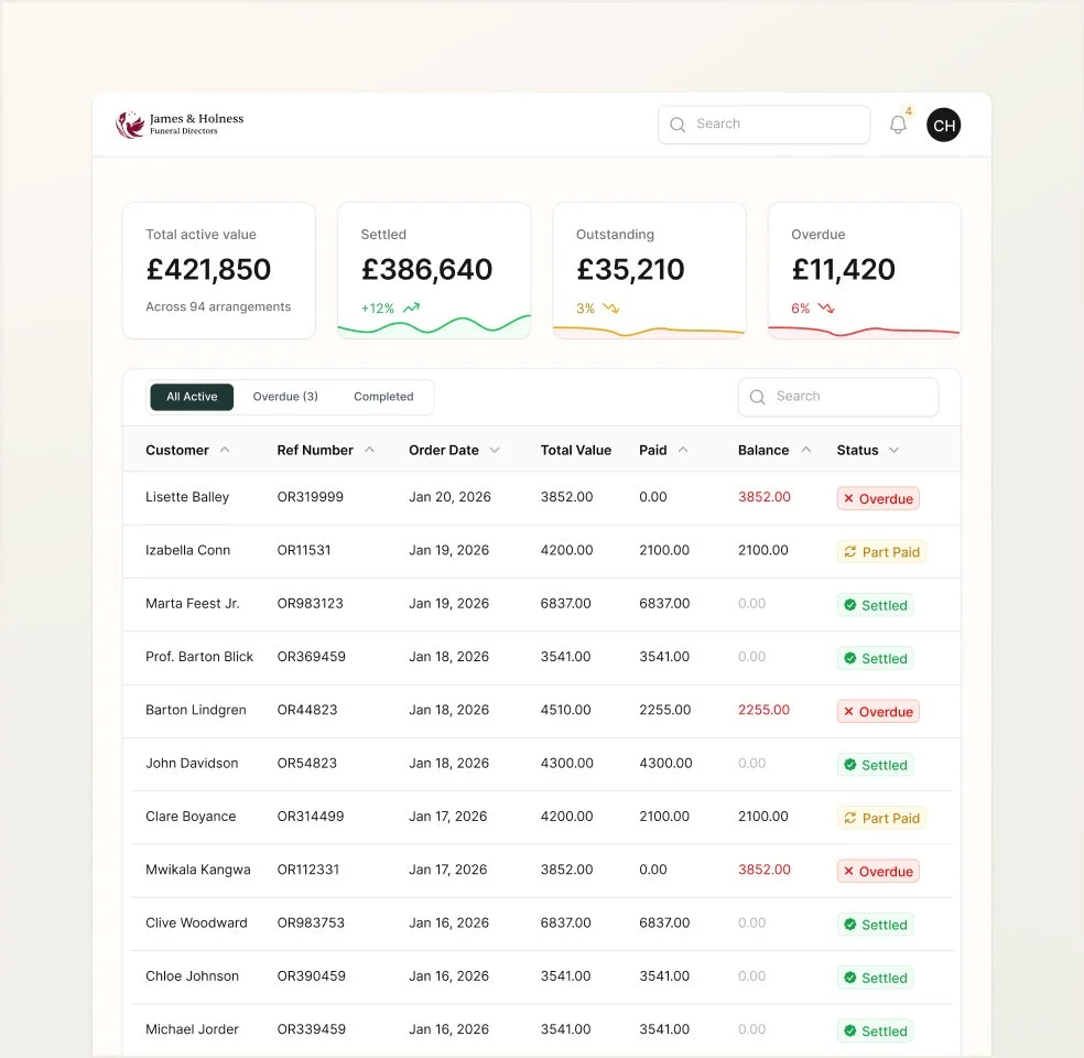 Chasing unpaid invoices during grief feels awkward, emotional and challenging. Manual systems force difficult conversations before and after the funeral.